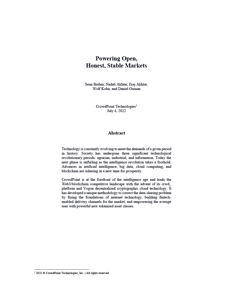 CrowdPoint's mission is to help create a new type of internet, one that is more decentralized, open, and fair. Where users have power and control over their data. As a digital systems builder, CrowdPoint is singular in our purpose: Deliver dividends to the heart of the internet, you.